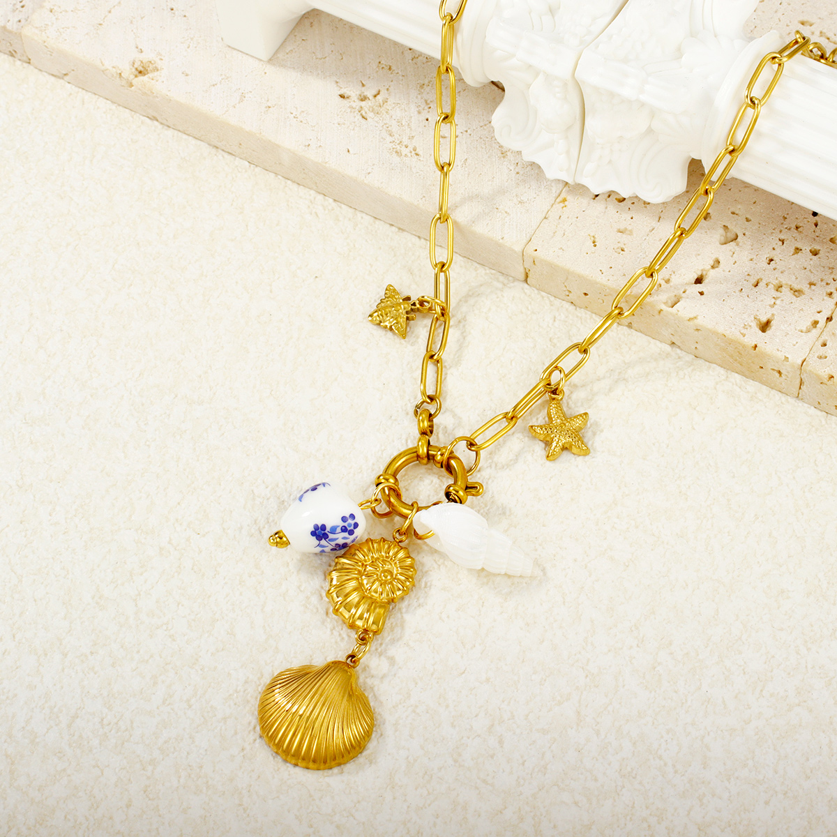 "时尚18K镀金不锈钢太阳贝壳陶瓷鱼项链"