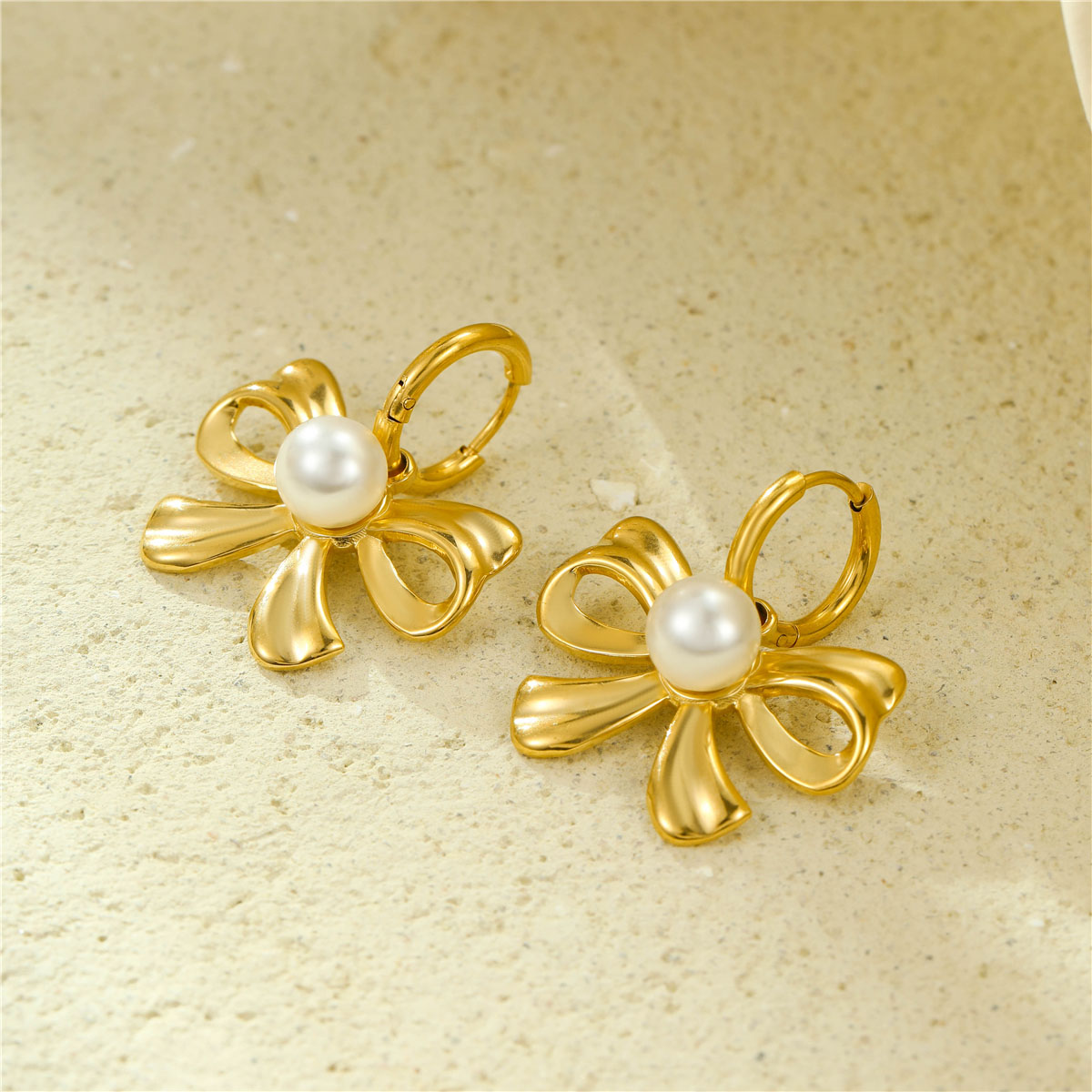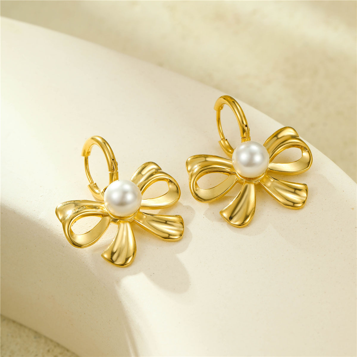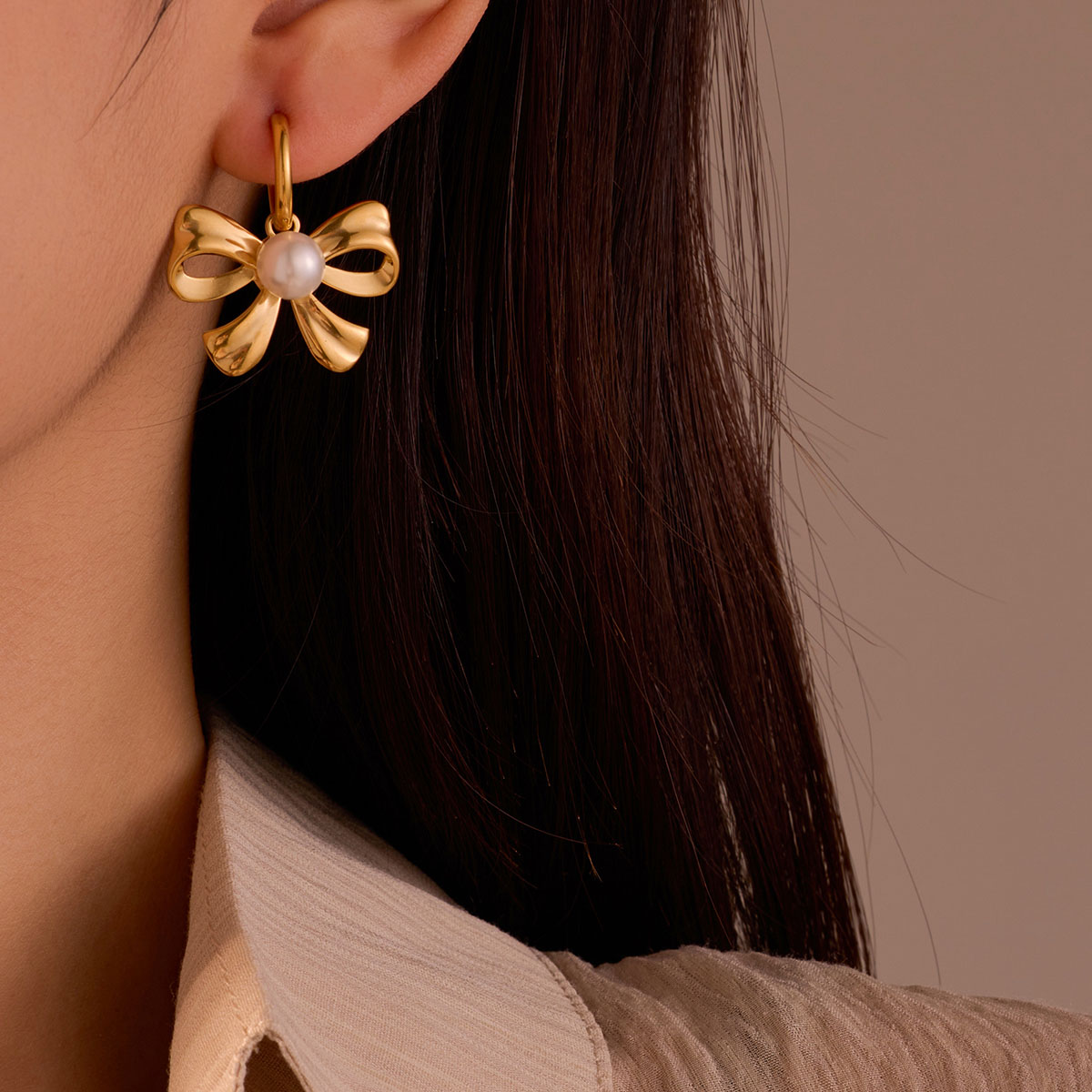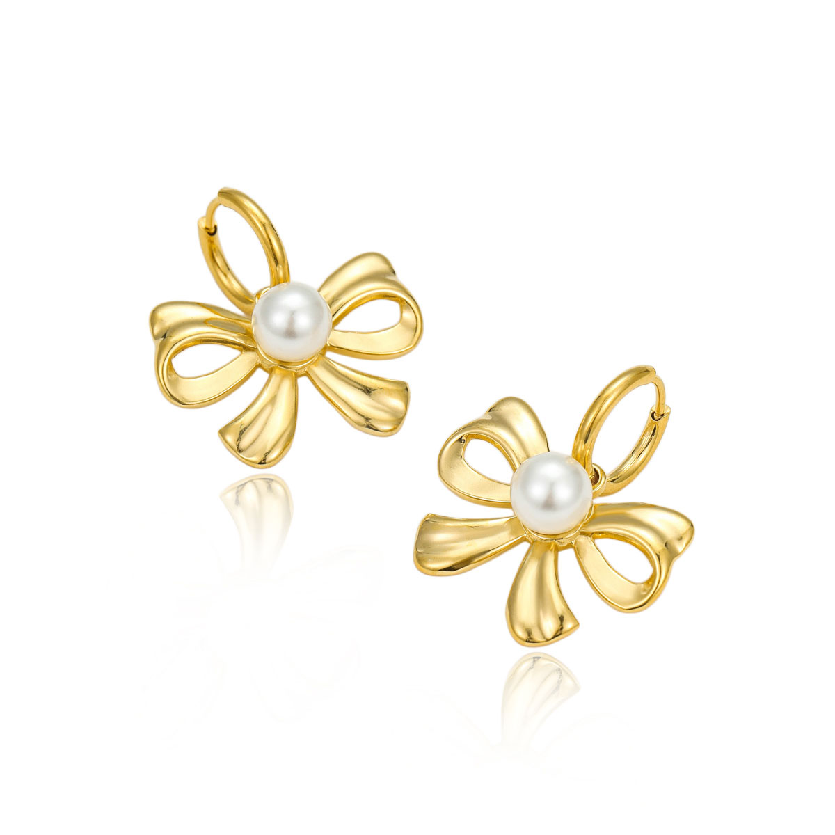 金色PVD镀金可爱珍珠蝴蝶结耳环